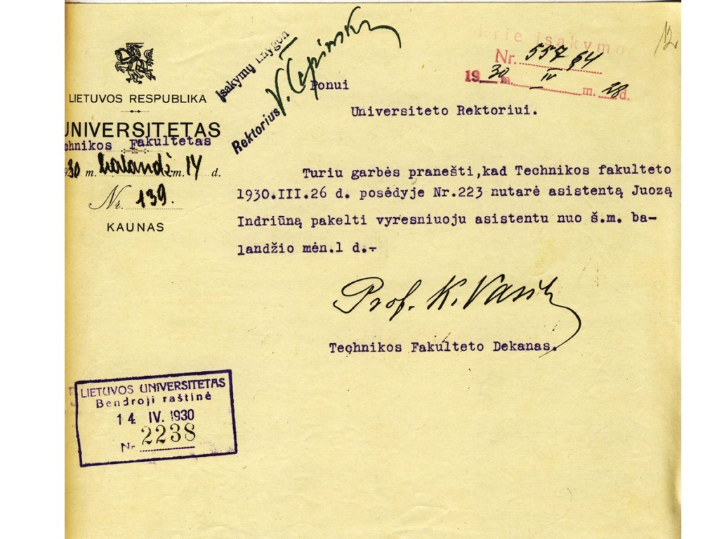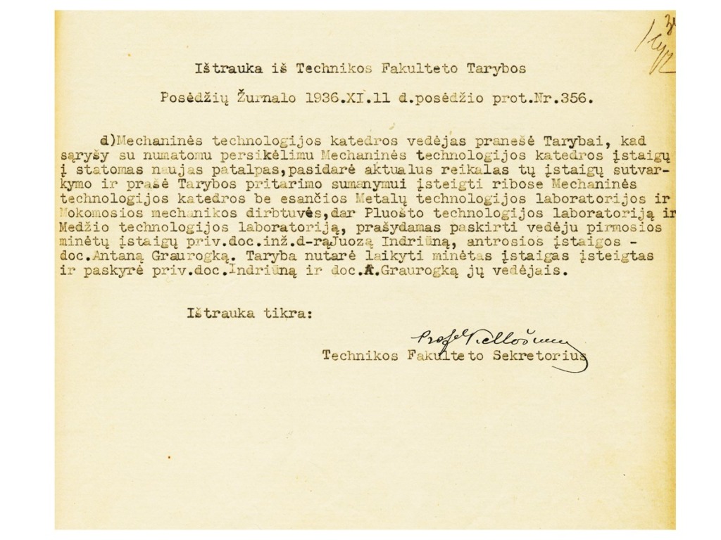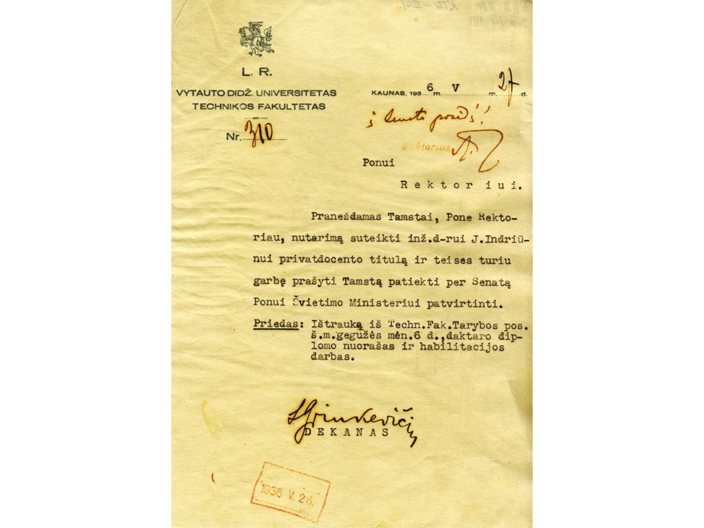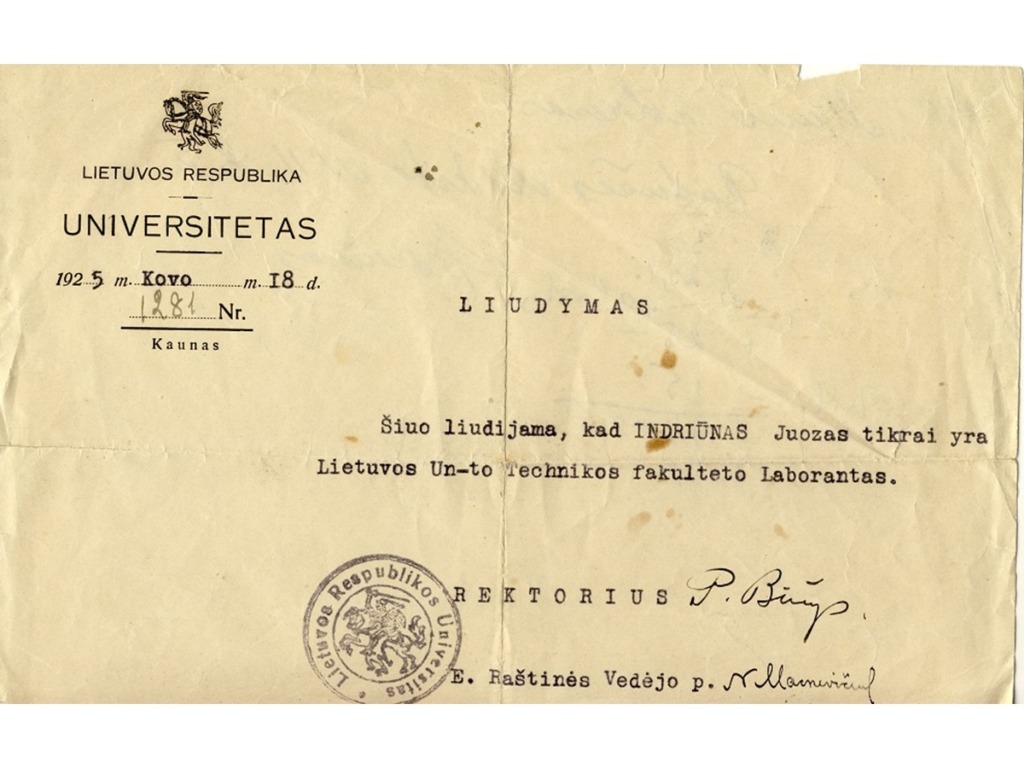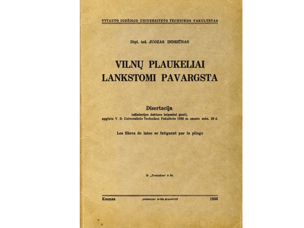 Juozas Indriūnas was born on January 26, 1896, in Bajoriškės (Rokiškis district). From 1908 to 1912, he attended Panemunėlis Primary School. In 1914, he graduated from the two-year school in Kupiškis (incomplete gymnasium). From 1914 to 1915, he worked as a government inspector at the Treugolnaja rubber factory in St. Petersburg and attended private courses to obtain his high school diploma. From 1915 to 1916, he taught at Pineva Elementary School. In 1916, he was arrested by the German occupation authorities for publishing illegal Lithuanian press and distributing leaflets, and was imprisoned in a prisoner-of-war camp in Gruntal, Germany, until 1918. From 1918 to 1920, he worked as a primary school teacher in Žardeliškės. In 1920, he was an auditor at the Higher Courses in Kaunas. In 1921, he passed his final exams as an external student and in 1922 was accepted as a student at the Faculty of Technology at the University of Lithuania. In 1929, he obtained a degree in engineering technology. In 1930–1931, he specialized at the technical universities of Stuttgart and Dresden. While still a student, he began working at the university. In 1922, he was appointed laboratory assistant at the Department of Construction Mechanics, where he actively assisted Prof. K. Vasiliauskas in setting up a materials resistance laboratory. In 1929, he was transferred to the position of assistant, and in 1930, to the position of senior assistant. In 1930, on the initiative of J. Indriūnas, a textile materials research laboratory was established at the materials resistance laboratory. In 1936, he defended his dissertation “Wool fibers bend and tire.” He was awarded a doctorate in engineering, and in 1937, he was awarded the title of associate professor. In 1937, on his initiative, a fiber technology laboratory was set up in the premises of the University’s Institute of Physics and Chemistry. In 1941, the Department of Textile Technology was established at the University, and Juozas Indriūnas was appointed professor and head of the department.