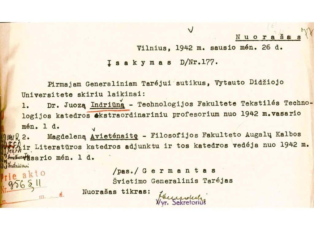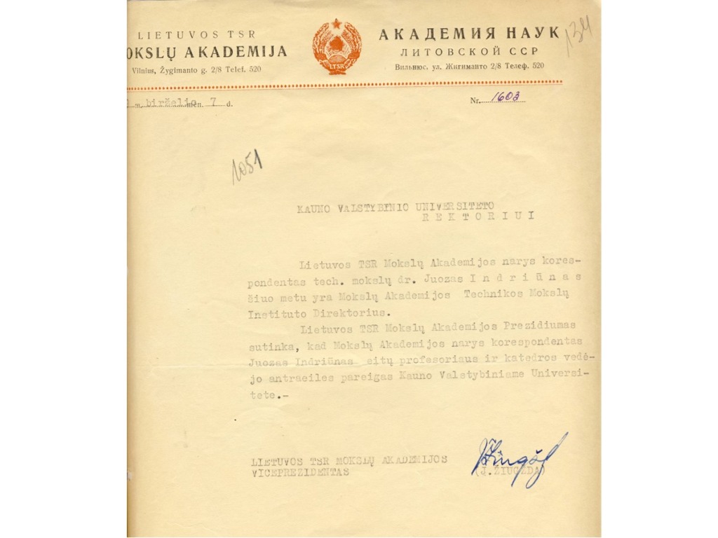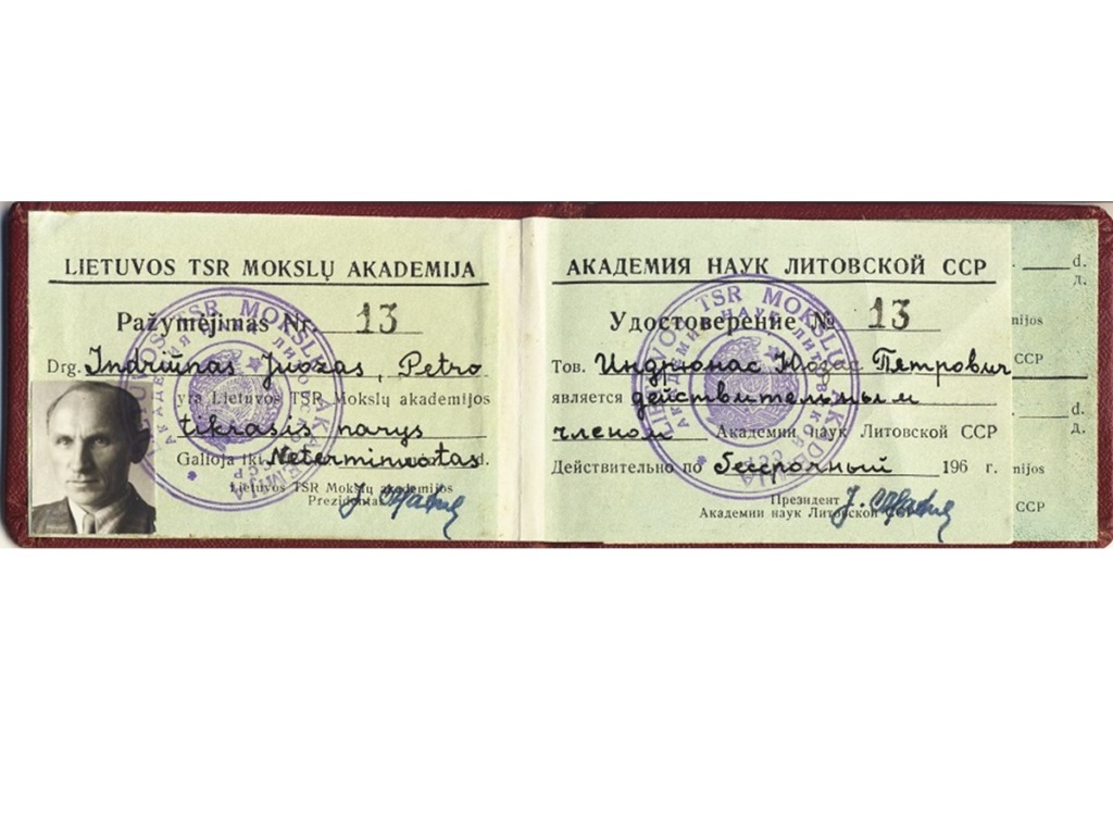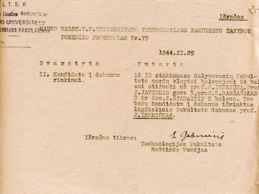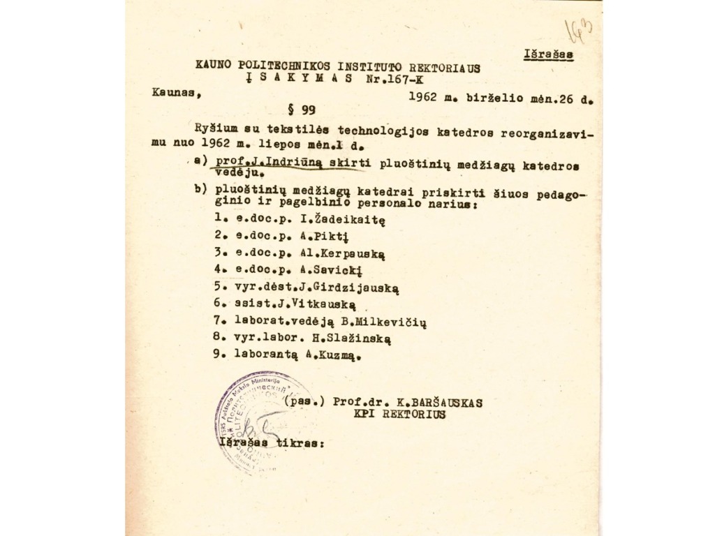 Juozas Indriūnas was born on January 26, 1896, in Bajoriškės (Rokiškis district). From 1908 to 1912, he attended Panemunėlis Primary School. In 1914, he graduated from the two-year school in Kupiškis (incomplete gymnasium). From 1914 to 1915, he worked as a government inspector at the Treugolnaja rubber factory in St. Petersburg and attended private courses to obtain his high school diploma. From 1915 to 1916, he taught at Pineva Elementary School. In 1916, he was arrested by the German occupation authorities for publishing illegal Lithuanian press and distributing leaflets, and was imprisoned in a prisoner-of-war camp in Gruntal, Germany, until 1918. From 1918 to 1920, he worked as a primary school teacher in Žardeliškės. In 1920, he was an auditor at the Higher Courses in Kaunas. In 1921, he passed his final exams as an external student and in 1922 was accepted as a student at the Faculty of Technology at the University of Lithuania. In 1929, he obtained a degree in engineering technology. In 1930–1931, he specialized at the technical universities of Stuttgart and Dresden. While still a student, he began working at the university. In 1922, he was appointed laboratory assistant at the Department of Construction Mechanics, where he actively assisted Prof. K. Vasiliauskas in setting up a materials resistance laboratory. In 1929, he was transferred to the position of assistant, and in 1930, to the position of senior assistant. In 1930, on the initiative of J. Indriūnas, a textile materials research laboratory was established at the materials resistance laboratory. In 1936, he defended his dissertation “Wool fibers bend and tire.” He was awarded a doctorate in engineering, and in 1937, he was awarded the title of associate professor. In 1937, on his initiative, a fiber technology laboratory was set up in the premises of the University’s Institute of Physics and Chemistry. In 1941, the Department of Textile Technology was established at the University, and Juozas Indriūnas was appointed professor and head of the department.