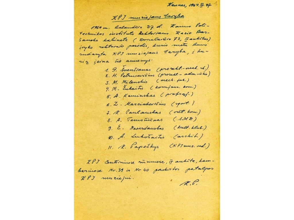 On 9 April 1964, Kazimieras Baršauskas, Rector of Kaunas Polytechnic Institute, initiated the establishment of the institute. Kazys Papečkys (1914–1973), a translator and writer who was then working as a teacher at the Department of Foreign Languages, was appointed as the first head of the museum. Soon, after the death of Rector Prof. K. Baršauskas, it was decided to set up a memorial room in one of the museum rooms, which was opened on 24 May 1965, to commemorate the first anniversary of the death of Prof. K. Baršauskas. In September 1966, the exhibition of KPI history was set up in the fourth-floor corridor and the second room. After completing the preparation of this exhibition, K. Papečkys was appointed editor at KPI Research Sector. On 15 March 1974, the exhibition in the second room of the museum was replaced by KPI Communist Youth History Museum, established at the initiative of Marijonas Martynaičius, who was the Rector at the time.