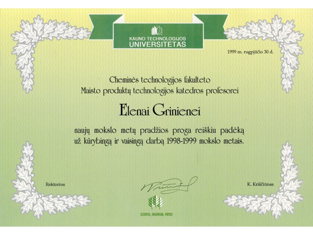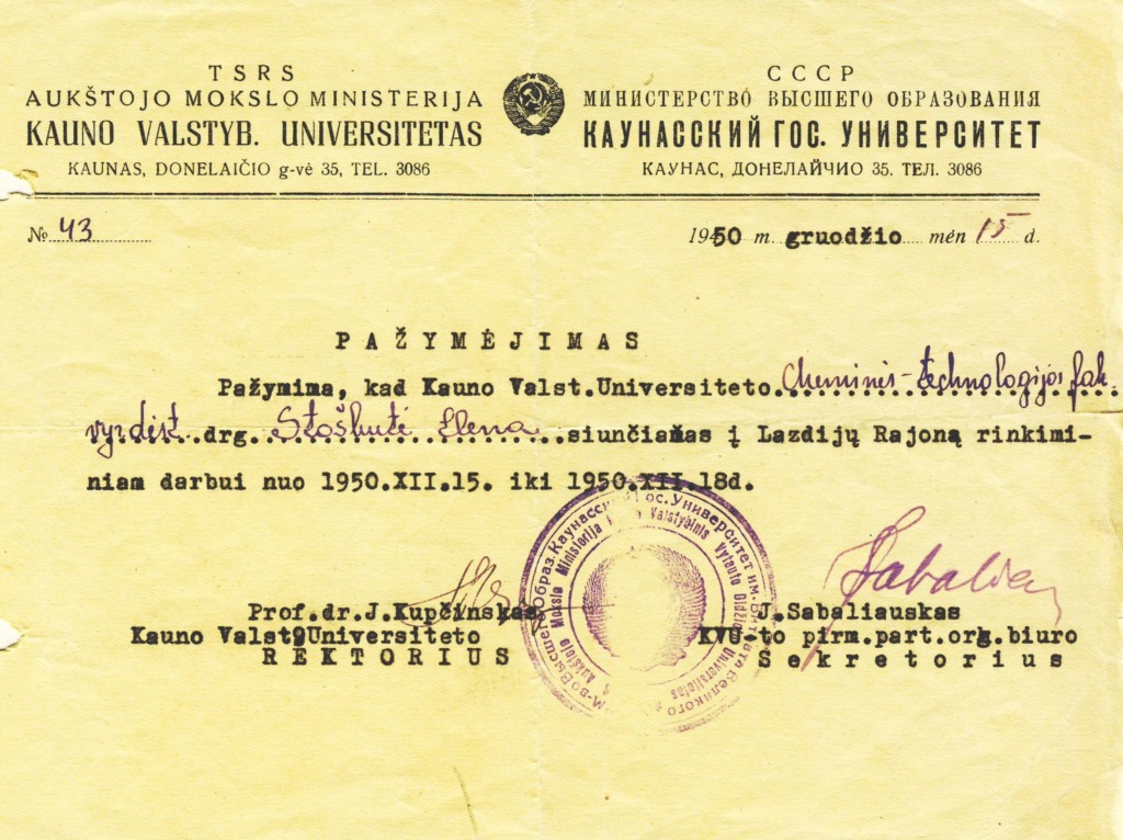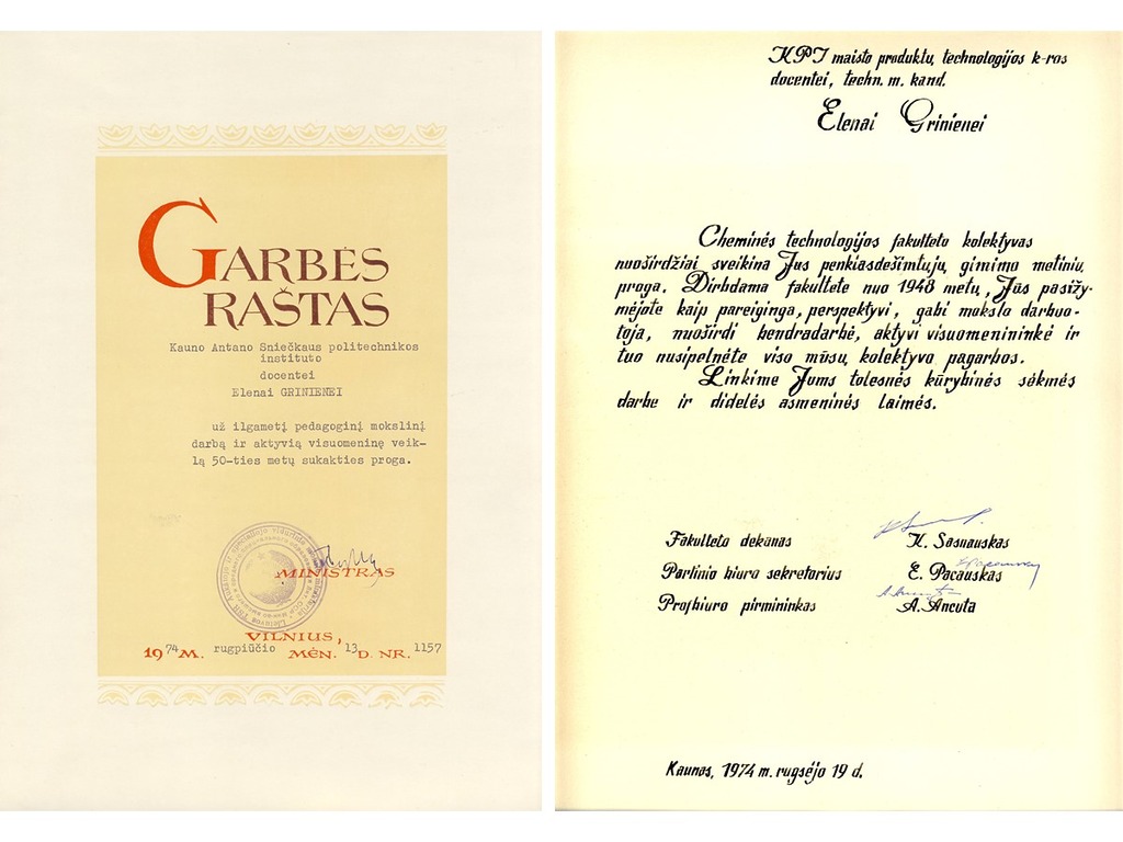 19 September 2024 marks the 100th anniversary of Elena Grinienė, a Lithuanian food technology engineer, Habilitated Doctor of Technology and KTU Professor. KTU Museum congratulates her on the occasion of this honourable anniversary and presents a virtual exhibition dedicated to her life’s journey “A Gifted Scientist and Sincere Colleague. 100th Anniversary of Prof. Elena Grinienė”. The exhibition consists of 5 parts: the first part is devoted to her studies and life in Raseiniai Gymnasium, the second part – to her studies and work at Kaunas State Vytautas Magnus University, the third part – to her work at Kaunas Polytechnic Institute, the fourth part – to her work at Kaunas University of Technology, and the fifth part – to her family. The photographs used in the exhibition are from the family archive of Prof. E. Grinienė. The author of the exhibition is the head of the Museum Dr. Audronė Veilentienė.