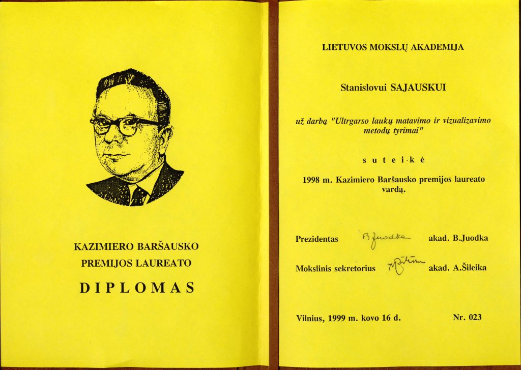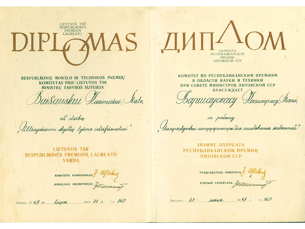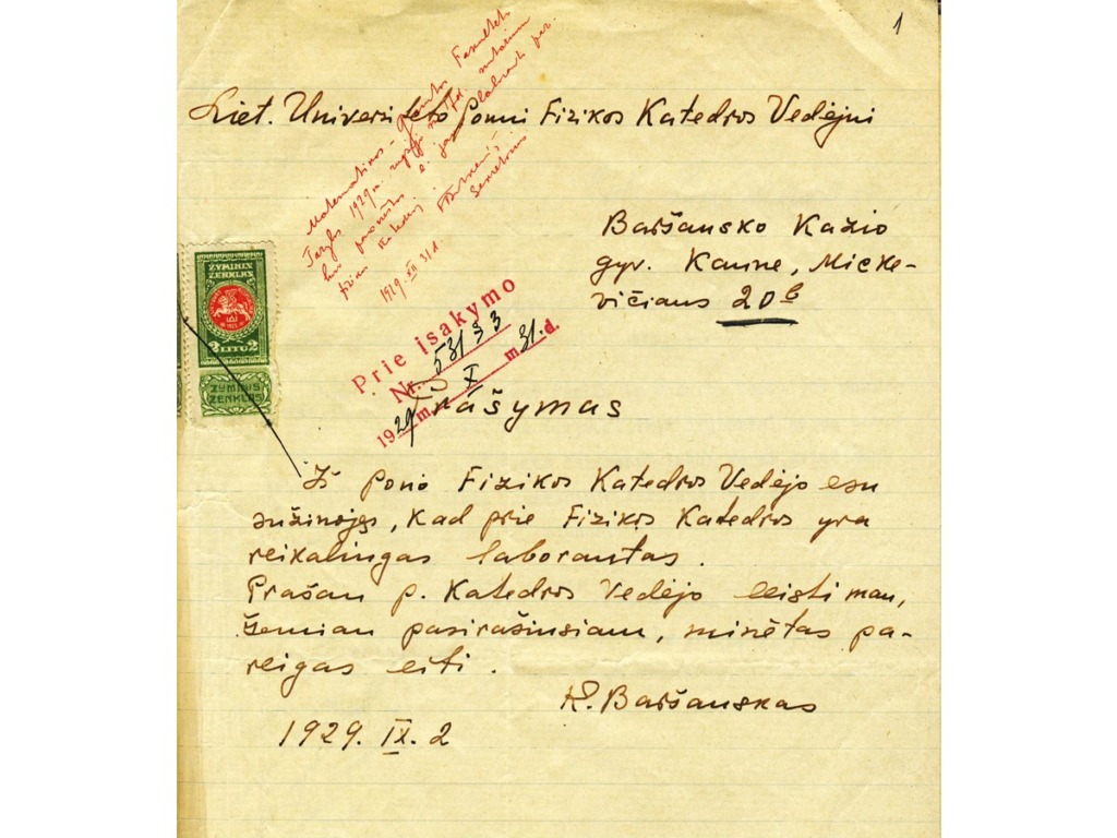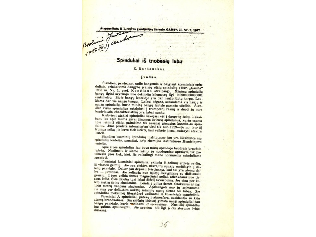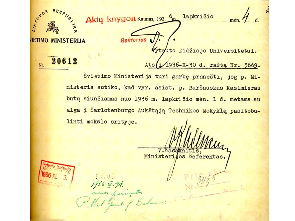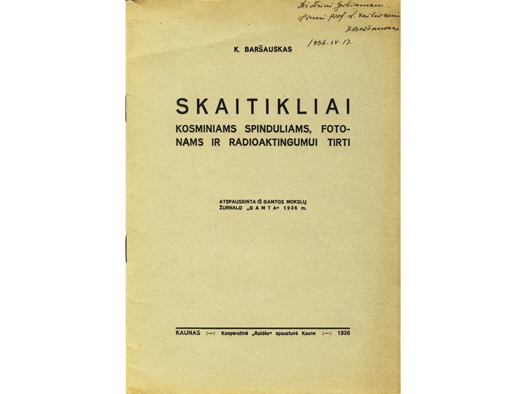 In 1929, while still studying at the University, K. Baršauskas was hired as a junior laboratory assistant in the Department of Physics. On 23 September 1930, he was awarded his University diploma, and on 3 November, he was conscripted for military service in the Lithuanian army. He joined the 5th infantry regiment of the Grand Duke Kęstutis of Lithuania, where he received initial military training. After 2 months, K. Baršauskas became a cadet-aspirant at the Military School and was later assigned to the 3rd artillery regiment. In the autumn of 1931, having received a proposal from Prof. Ignas Končius, K. Baršauskas took part in a competition for the position of junior laboratory assistant at the Department of Physics of the Faculty of Mathematics and Nature of VMU and was successful. He finished his military service only a year later, as he fell ill with typhoid fever and spent 3 weeks in a military hospital. Kazimieras Baršauskas resumed his position as a junior laboratory technician at the Department of Physics, and a year later was appointed as a senior laboratory technician and then assistant. K. Baršauskas became interested in the photoelectric effect and later in cosmic rays. He started to work in the Faculty of Mathematics and Science under the leadership of the Dean of the Faculty of Mathematics and Nature Prof. Z. Žemaitis, K. Baršauskas went to Berlin for a one-year fellowship at the Institute of Physics of the Higher Technical School in Charlottenburg, where he studied with the prominent cosmic ray specialist Prof. Hans Geiger. There he learned how to make cosmic ray detectors, set up the necessary equipment and conducted many experiments, the results of which he summarised in the article entitled “Reports on the Distribution of Energy in the Groups of Cosmic Rays”. The article was published in Zeitschrift für Physik, one of the most authoritative physics journals of the time. Upon returning to Kaunas, he continued his scientific work and defended his doctoral thesis on the energy distribution in secondary cosmic rays in 1938.