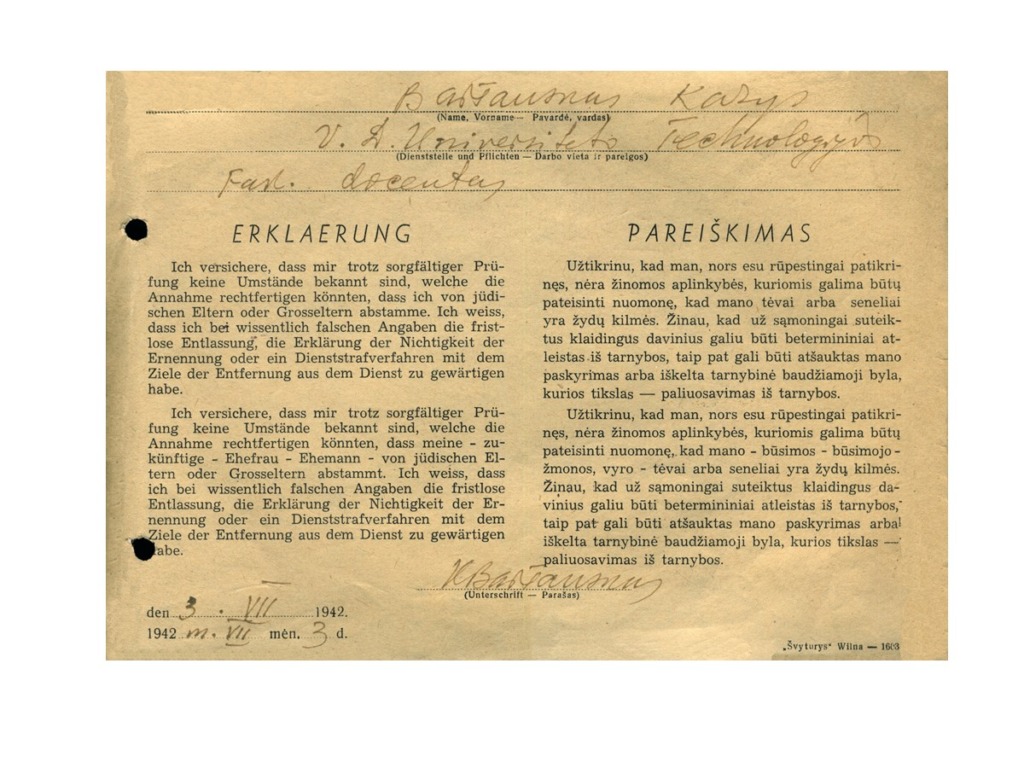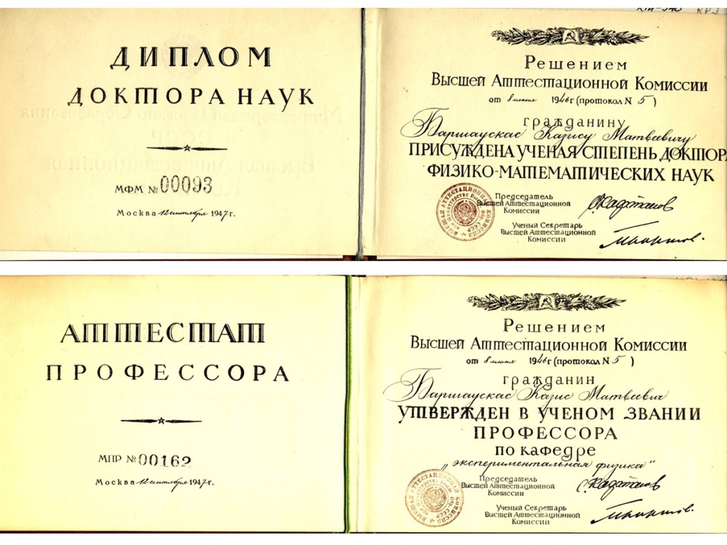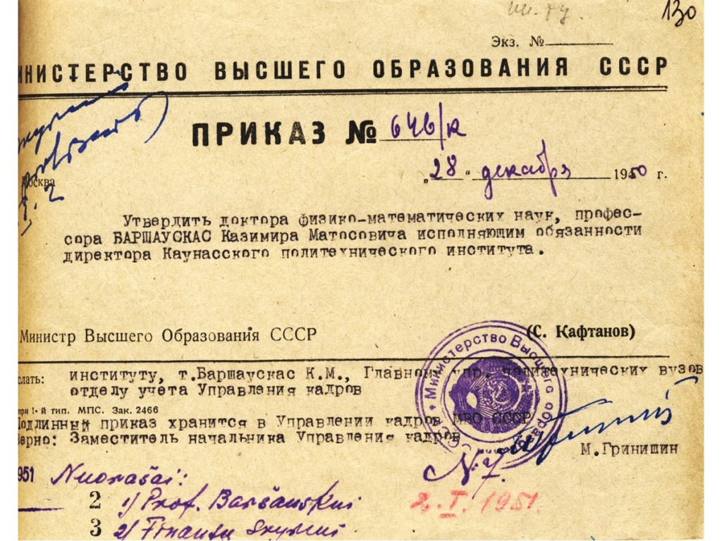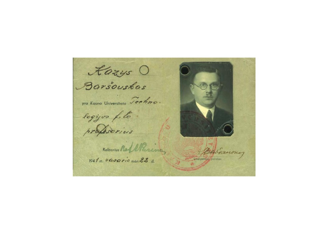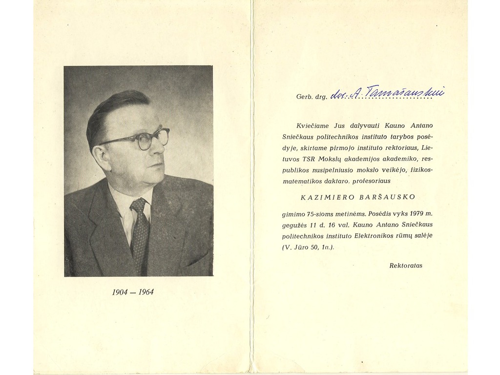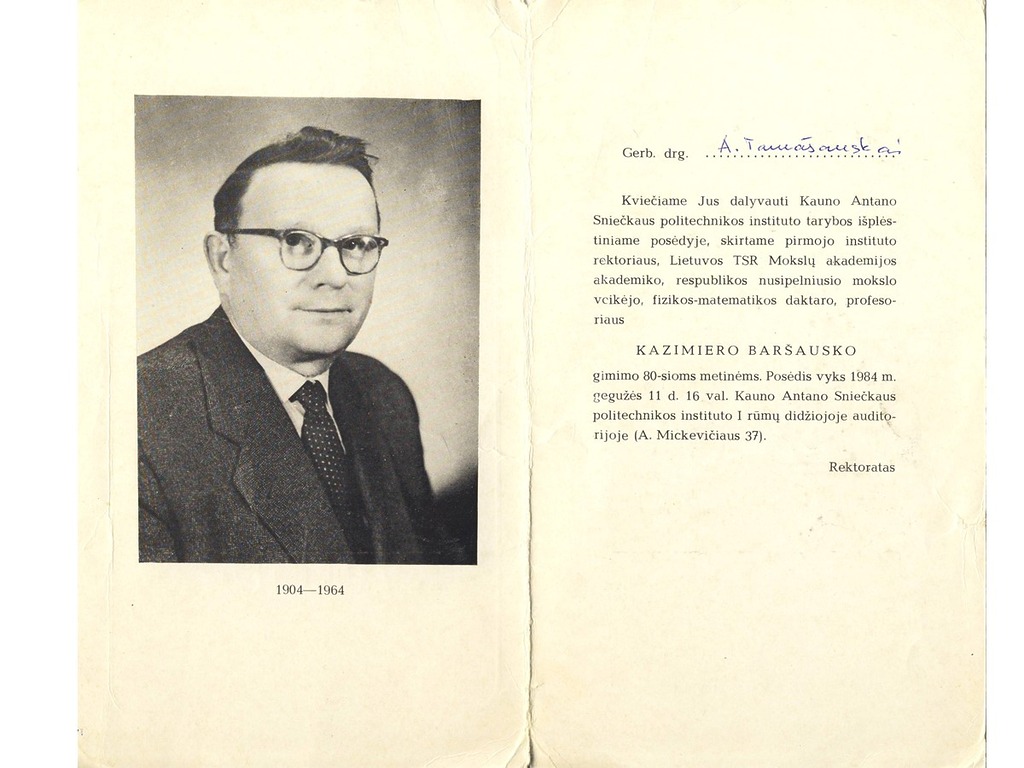 After the Soviet Union occupied Lithuania in 1940, Vytautas Magnus University was renamed Kaunas University. K. Baršauskas was appointed as an associate professor, and later as the head and professor of the Department of Physics. When the Germans occupied Lithuania, K. Baršauskas was dismissed from the position of the head of the Department of Physics. When the occupiers suspended lectures at the University, Assoc. Prof. K. Baršauskas urged them to disregard the ban and to admit students to the first year for the academic year 1943-1944. He used the cover of the Adult Institute of evening studies, founded in 1941, and officially organised courses for technicians, which attempted to complete the curriculum of the first year of University studies.