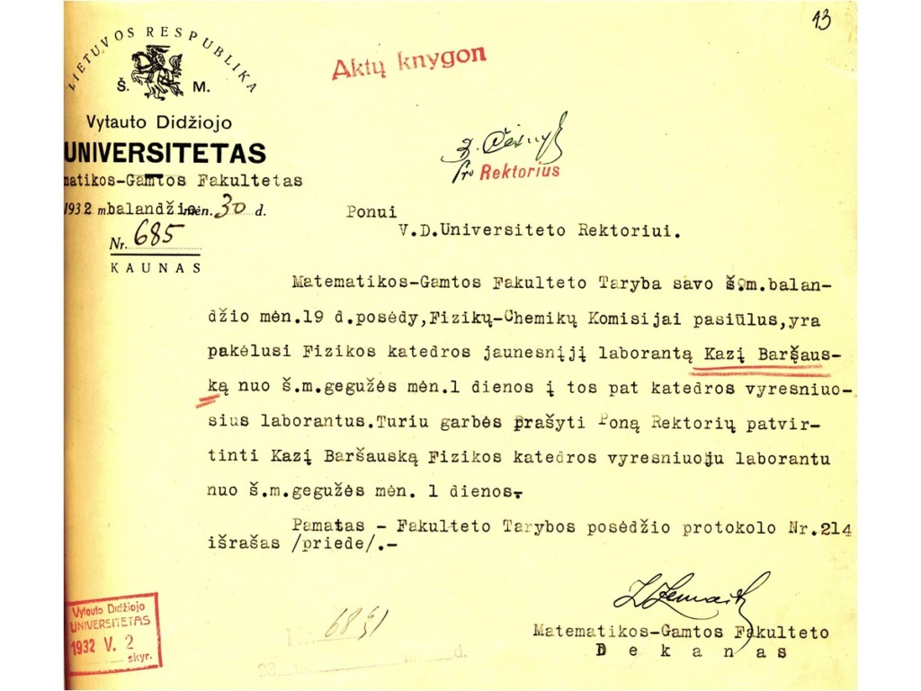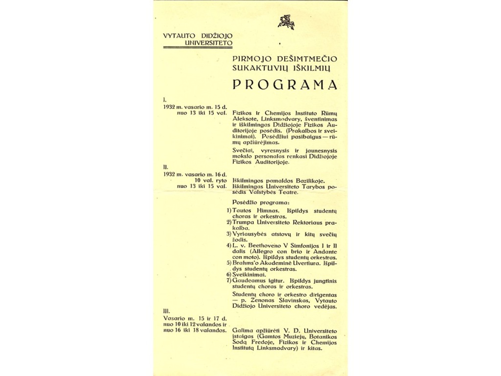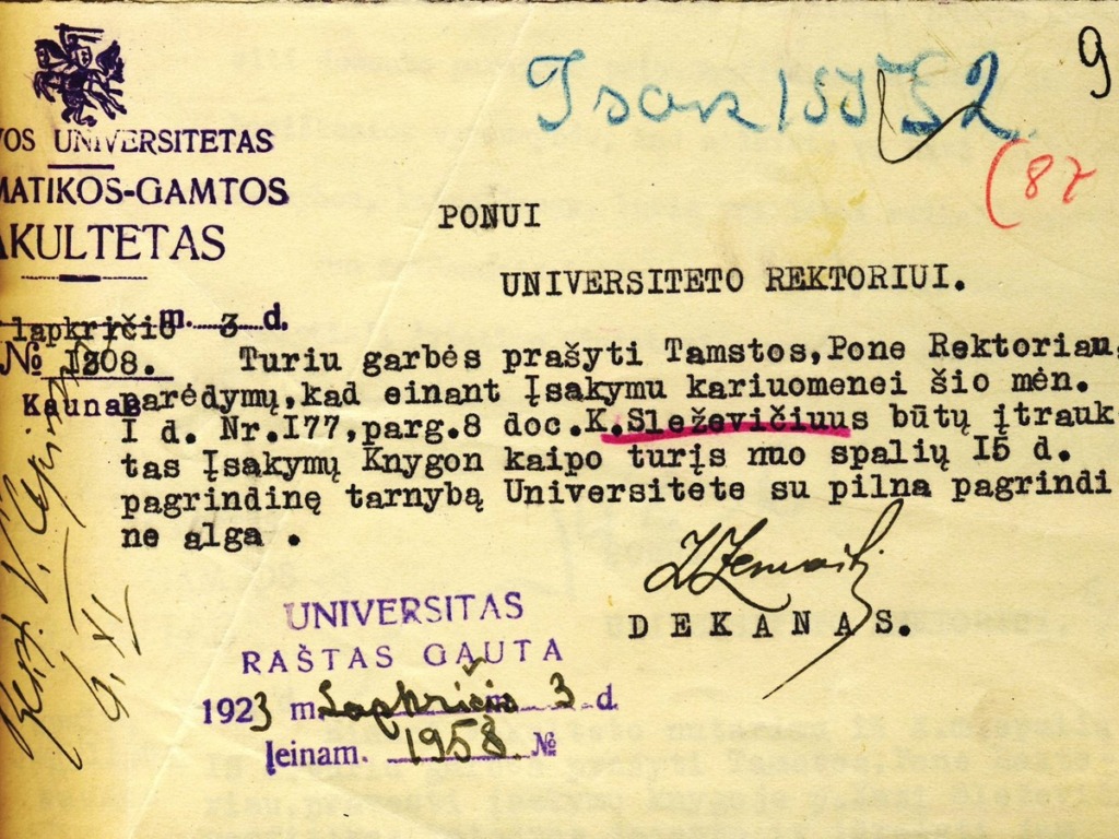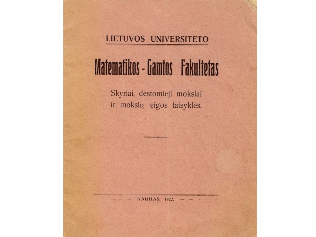 Since Z. Žemaitis was very concerned about the education of the Lithuanian youth, he wrote a memorandum to the Lithuanian government regarding the establishment of a university in Kaunas in 1919. On 8 October 1919, Z. Žemaitis, T. Ivanauskas, A. Janulaitis, J. Vabalas-Gudaitis, L. Vailionis and E. Volteris already convened a meeting of public figures. At the initiative of this meeting, the Higher Education Society was established, which founded the Higher Courses, opened on 27 January 1920. Z. Žemaitis was the first head of the Courses. 16 February 1922 marks the official opening of the University of Lithuania in Kaunas with 5 faculties based on the Higher Courses. By the President’s order, Z. Žemaitis was appointed the dean of the Faculty of Mathematics and Nature. He remained in this position until 1940. From 1922 to 1940, Z. Žemaitis was a professor at this university, and from 1930 to 1940, he was the head of the Department of Geometry. The main fields of activities of Prof. Z. Žemaitis were the teaching methodology of mathematics, the history of mathematics, and the improvement of the terminology of Lithuanian mathematics. The scientist published his work in the collections of scientific papers of Vytautas Magnus University. In 1920, he compiled the “Collection of Terms for Geometry and Trigonometry”, wrote the books “Mathematics Historiography and Moritz Kantor” (1930) and “Differential-Integral Calculus” (part 2, 1935). He wrote articles on Archimedes, Isaac Newton and other famous mathematicians. Mathematicians, physicists, chemists, biologists, geographers and, until 1924, agronomists studied at the Faculty of Mathematics and Nature. During that time, the Chamber of Physics and Chemistry was built in Aleksotas and Botanical Garden and Zoological Museum were established.